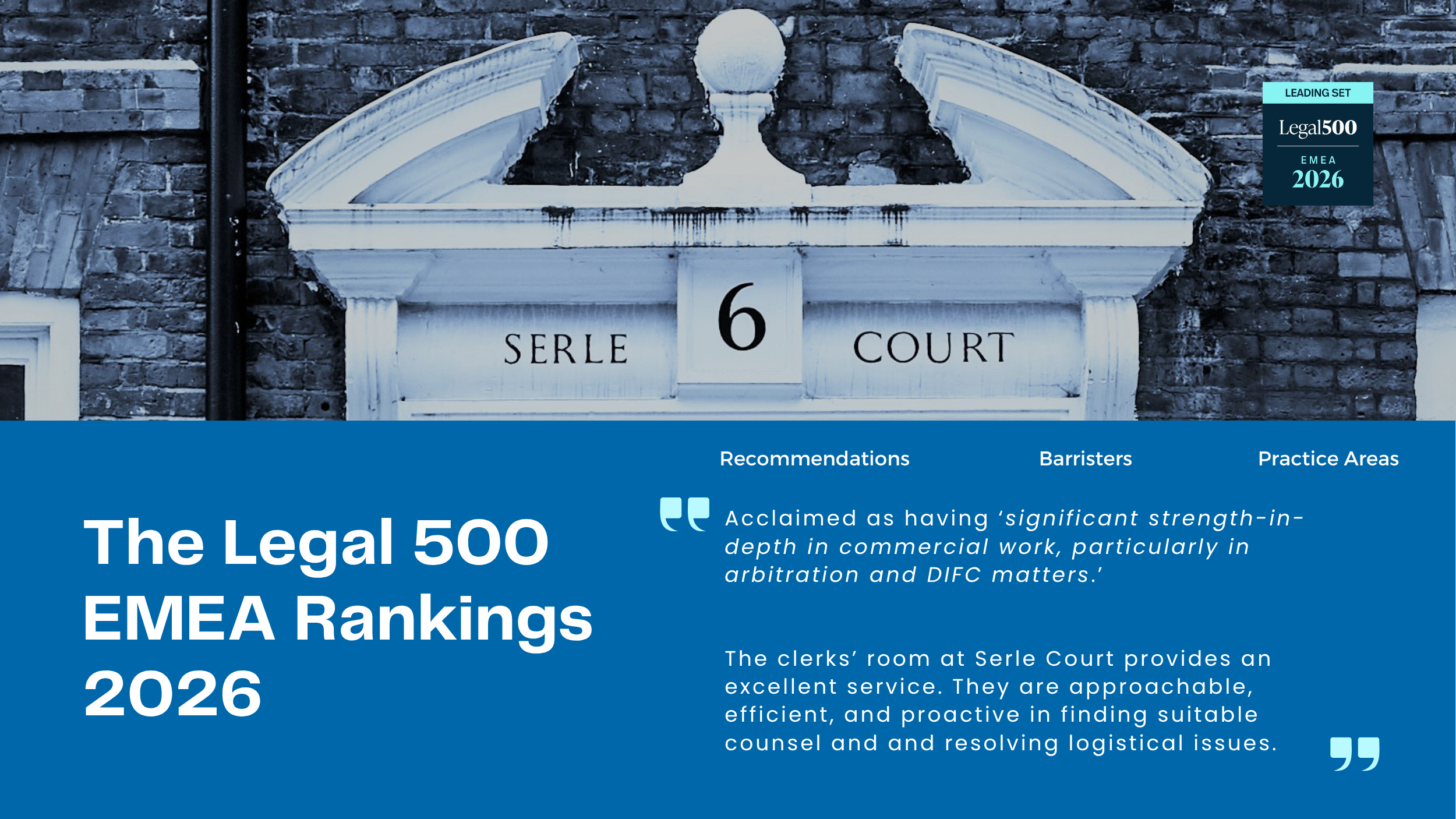 Serle Court is pleased to be recognised once again as a leading set in the Legal 500 Europe, Middle East, and Africa 2026. Acclaimed as having ‘significant strength-in-depth in commercial work, particularly in arbitration and DIFC matters’, our members are described as being highly experienced in the offshore UAE courts on major commercial and financial disputes at the silk and junior level.